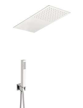 Set for shower, including: wall water connection with hand shower holder, ultra-flat wall-mounted shower head in mirror-polished stainless steel, 1-function squared abs hand shower, 150cm flexible hose. Set to be completed with a built-in mixer with diverter (not included).
