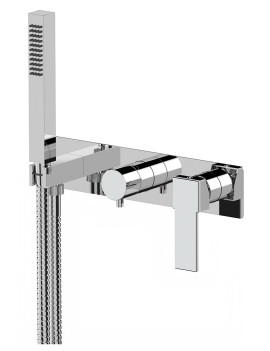 Set miscelatore a incasso a 3 vie per vasca/doccia su piastra rettangolare ultra-piatta, include: miscelatore, deviatore a 3 uscite, presa acqua con supporto, doccetta in ottone e flessibile 150 cm. Da completare con la seconda uscita.